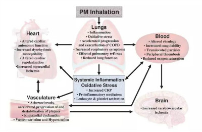 顆粒物的大小決定了它們最終在呼吸道中的位置,較大的顆粒物往往被纖毛和黏液過濾,無法通過鼻子和咽喉。但是,小于10微米的可吸入顆粒物(PM10),可以穿透這些屏障到達支氣管和肺泡。而小于2.5μm的細顆粒物(PM2.5),更容易吸附有毒害的物質,如一些重金屬鉛、鋅、砷、鎘等,由于體積小,PM2.5具有更強的穿透力,可直接抵達細支氣管壁,并干擾肺內的氣體交換。更小的微粒(直徑小于等于100納米,0.1微米)會通過肺部傳遞影響其他器官。PM由肺然后到其他器官的影響,可以參考下面這張圖(*1-參考資料來源,參見文末)。