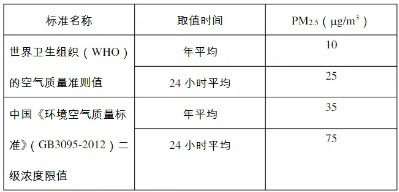 目前國內使用的空氣質量標準在PM2.5的要求上和世界衛生組織(WHO)的空氣質量準則值相比,無論是24小時平均或者年平均,相差都比較大。