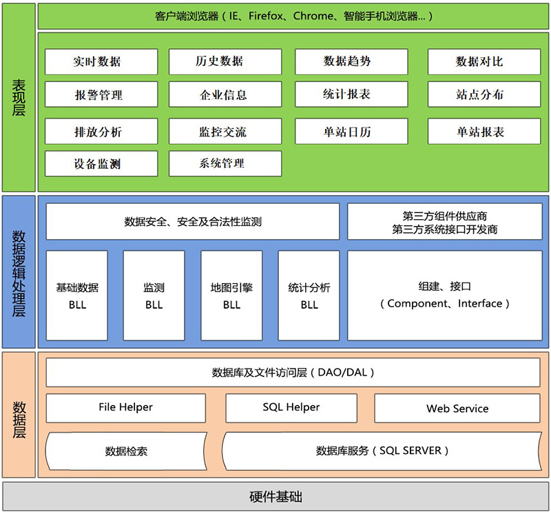 平臺的主要功能模塊包括:實時數(shù)據(jù)、歷史數(shù)據(jù)、數(shù)據(jù)趨勢、數(shù)據(jù)質(zhì)量、站點分布、統(tǒng)計報表、單站報表、數(shù)據(jù)通比、單站日歷、排放分析、報警管理、企業(yè)信息、監(jiān)控交流和系統(tǒng)管理等。
