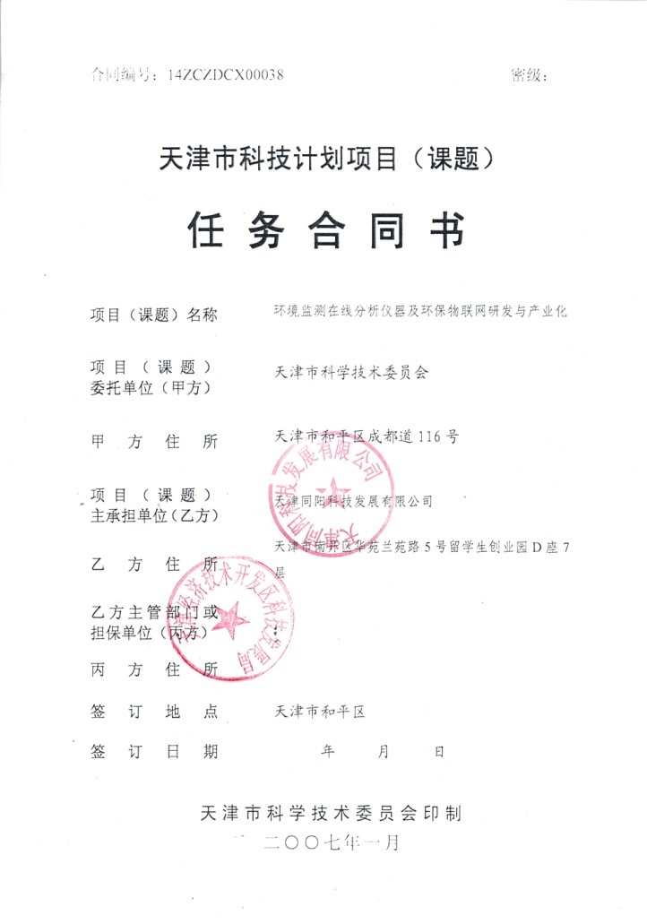 同陽科技獲得“2014年天津市科技支撐計劃重點項目”立項支持 更新時間:2014-11-21 點擊:25174 所屬欄目:公司新聞 Update Time:2014-11-21 Hits:25174 Belong Column:News 2014年11月19日,由天津同陽科技發展有限公司牽頭的“環境監測在線分析儀器及環保物聯網研發與產業化”項目,經天津市科學技術委員會批準列入“2014年天津市科技支撐計劃重點項目”,在“資源環境”領域獲得立項支持。